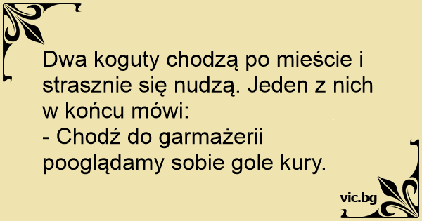 Dwa koguty chodzą po mieście i strasznie się nudzą. Jeden z nich w końcu mówi: