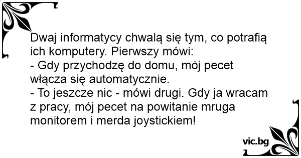 - To jeszcze nic - mówi drugi. Gdy ja wracam z pracy, mój pecet na powitanie mruga monitorem i меrdа joystickiem!