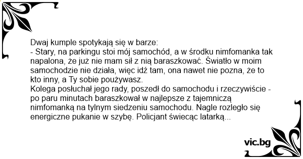 Kolega posłuchał jego rady, poszedł do samochodu i rzeczywiście - po paru minutach baraszkował w najlepsze z tajemniczą nimfomanką na tylnym siedzeniu samochodu. Nagle rozległo się energiczne pukanie w szybę. Policjant świecąc latarką do środka wozu upomniał kochanków: