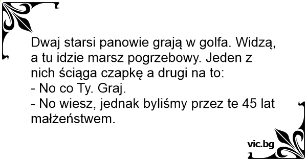 Dwóch Anglików w średnim wieku gra w golfa. w pewnej chwili obok pola golfowego przechodzi kondukt żałobny. Jeden z grających odkłada kij i zdejmuje czapkę. - Cóż to - dziwi się drugi - przerywa...