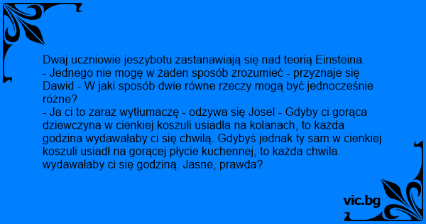 - Ja ci to zaraz wytłumaczę - odzywa się Josel - Gdyby ci gorąca dziewczyna w cienkiej koszuli usiadła na kolanach, to każda godzina wydawałaby ci się chwilą. Gdybyś jednak ty sam w cienkiej koszuli usiadł na gorącej płycie kuchennej, to każda chwila wydawałaby ci się godziną. Jasne, prawda?