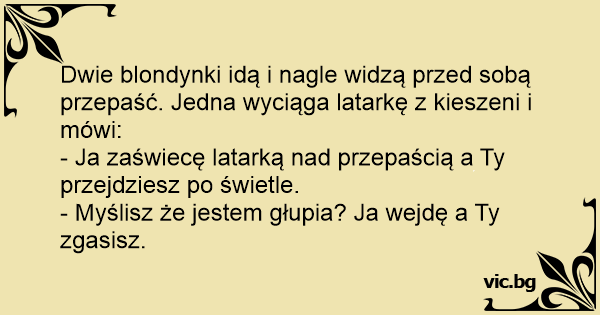 Dwie blondynki idą i nagle widzą przed sobą przepaść. Jedna wyciąga latarkę z kieszeni i mówi: