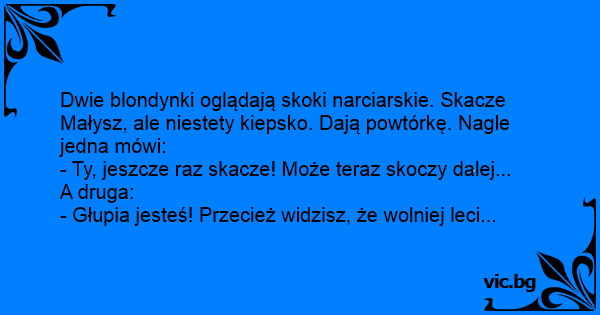 Dwie blondynki oglądają skoki narciarskie. Skacze Małysz, ale niestety kiepsko. Dają powtórkę. Nagle jedna mówi: