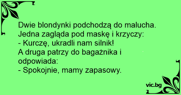 Jadą dwie blondynki maluchem. Nagle maluch zgasł. Jedna z nich wysiada i otwiera przednią maskę i mówi: - Ty silnik nam ukradli. Na co druga otwiera tylną maskę i mówi: - Nie martw się, mamy...