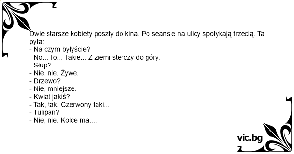 Dwie starsze kobiety poszły do kina. Po seansie na ulicy spotykają trzecią. Ta pyta:
