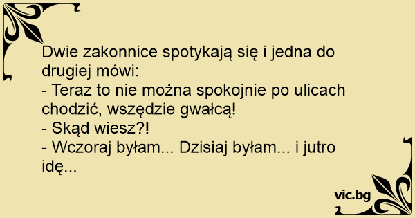 Dwie zakonnice spotykają się i jedna do drugiej mówi: