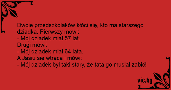 Dwoje przedszkolaków kłóci się, kto ma starszego dziadka. Pierwszy mówi: