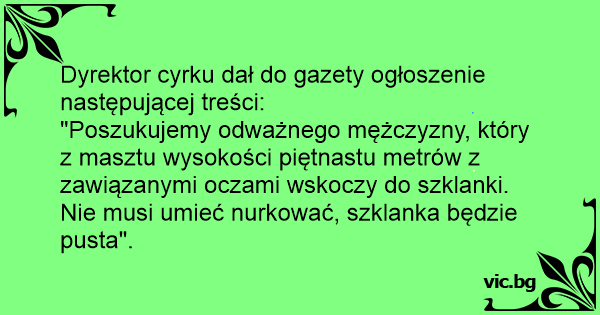 "Poszukujemy odważnego mężczyzny, który z masztu wysokości piętnastu metrów z zawiązanymi oczami wskoczy do szklanki. Nie musi umieć nurkować, szklanka będzie pusta".
