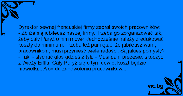 - Tak! - słychać głos gdzieś z tyłu - Musi pan, prezesie, skoczyć z Wieży Eiffla. Cały Paryż się o tym dowie, koszt będzie niewielki... A co do zadowolenia pracowników...