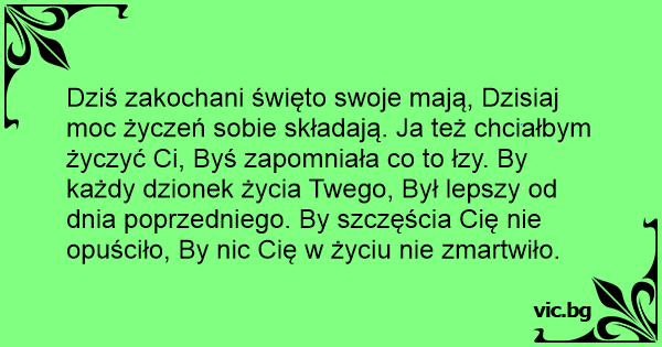 Dziś zakochani święto swoje mają, Dzisiaj moc życzeń sobie składają. Ja też chciałbym życzyć Ci, Byś zapomniała co to łzy. By każdy dzionek życia Twego, Był lepszy od dnia poprzedniego. By szczęścia Cię nie opuściło, By nic Cię w życiu nie zmartwiło.