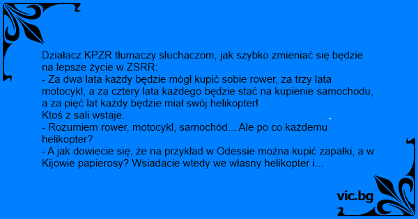 - Za dwa lata każdy będzie mógł kupić sobie rower, za trzy lata motocykl, a za cztery lata każdego będzie stać na kupienie samochodu, a za pięć lat każdy będzie miał swój helikopter!