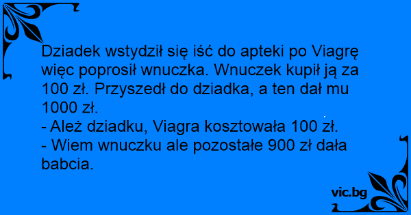 Dziadek wstydził się iść do apteki po Viagrę więc poprosił wnuczka. Wnuczek kupił ją za 100 zł. Przyszedł do dziadka, a ten dał mu 1000 zł.