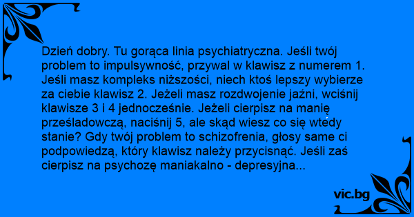 Dzień dobry. Tu gorąca linia psychiatryczna. Jeśli twój problem to impulsywność, przywal w klawisz z numerem 1. Jeśli masz kompleks niższości, niech ktoś lepszy wybierze za ciebie klawisz 2. Jeżeli masz rozdwojenie jaźni, wciśnij klawisze 3 i 4 jednocześnie. Jeżeli cierpisz na manię prześladowczą, naciśnij 5, ale skąd wiesz co się wtedy stanie? Gdy twój problem to schizofrenia, głosy same ci podpowiedzą, który klawisz należy przycisnąć. Jeśli zaś cierpisz na psychozę maniakalno - depresyjna to i tak nikt z tobą nie będzie gadał. W pozostałych przypadkach zostaw wiadomość po usłyszeniu sygnału.