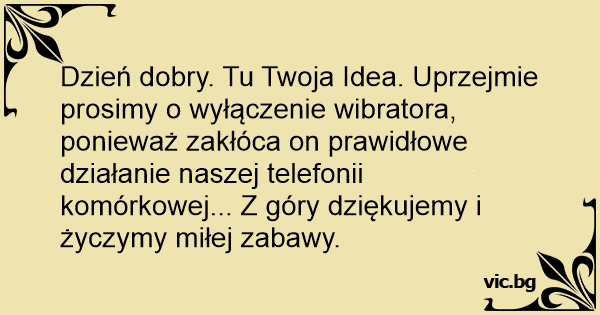 Dzień dobry. Tu Twoja Idea. Uprzejmie prosimy o wyłączenie wibratora, ponieważ zakłóca on prawidłowe działanie naszej telefonii komórkowej... Z góry dziękujemy i życzymy miłej zabawy.