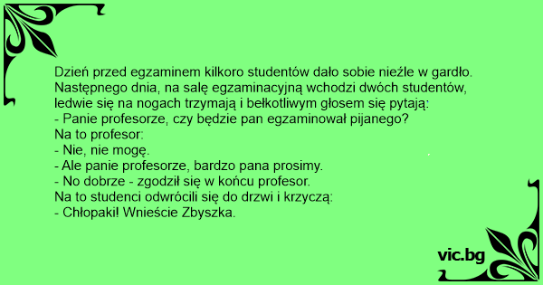 Dzień przed egzaminem kilkoro studentów dało sobie nieźle w gardło. Następnego dnia, na salę egzaminacyjną wchodzi dwóch studentów, ledwie się na nogach trzymają i bełkotliwym głosem się pytają: