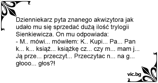 Dzienniekarz pyta znanego akwizytora jak udało mu się sprzedać dużą ilość trylogii Sienkiewicza. On mu odpowiada:
