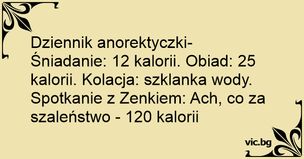 Dziennik anorektyczki- Śniadanie: 12 kalorii. Obiad: 25 kalorii. Kolacja: szklanka wody. Spotkanie z Zenkiem: Ach, co za szaleństwo - 120 kalorii