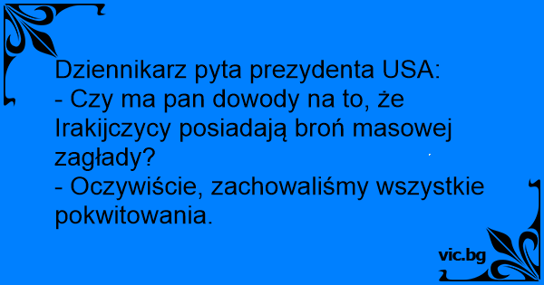 Na tiskové konferenci: „Pane prezidente Bushi, máte důkazy, že Irák vlastní zbraně hromadného ničení?” „Ano,” pronese americký prezident triumfálně, „máme schované stvrzenky o zaplacení!”