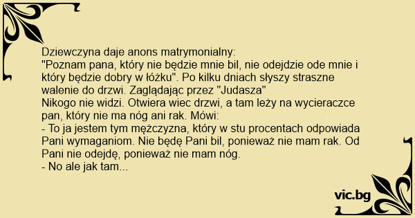 - To ja jestem tym mężczyzna, który w stu procentach odpowiada Pani wymaganiom. Nie będę Pani bil, ponieważ nie mam rak. Od Pani nie odejdę, ponieważ nie mam nóg.