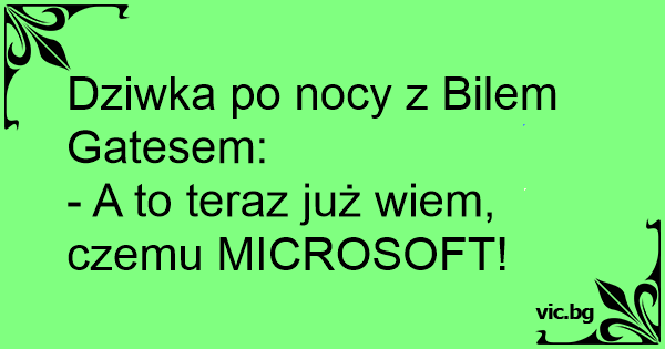 Bill Gates' Honeymoon Hochzeitsnacht von Bill Gates. Am nächsten Morgen sagt seine Frau: ,"Jetzt weiss ich auch, warum Du Dein Unternehmen "Microsoft" genannt hast. Знаете ли кой е дал името на компанията на Бил Гейтс - MicroSoft?! ,Жена му - през първата им брачна нощ !!! Cosa dice la moglie di Bill Gates mentre fanno l'amore? - Bill, sei così MICRO, sei così SOFT. Bill gates had het verhaal van Clinton en Lewinsky gelezen op CNN.com en dacht dat wil ik ook. Hij belt met Monica, maar die zegt nee. Bill gates, als rijkste man van de wereld, doet haar echter... La mujer de Bill Gates ha pedido la anulacion de su reciente matrimonio porque en la noche de bodas se enteró de lo que MICRO SOFT realmente significaba. Bill Gates komt een keertje in Brussel. Uiteraard bezoekt hij de hoertjes. Op een gegeven moment kleedt hij zich dus uit, maar op het moment dat hij z'n onderbroek laat zakken begint de hoer ineens... Mitä Bill Gatesin vaimo sanoi hääyön jälkeen? Nyt tiedän, mistä ”Microsoft” on saanut nimensä. Ce i-a spus nevasta lui Bill Gates după noaptea nunţii? Abia acum înţeleg de ce ţi-ai denumit compania MICROsoft. Dupa o partida de sex, nevasta lui Bill Gates isi da seama de ce compania lui se numeste "Microsoft". 0  Loading ... Po pirmosios vestuvių nakties Bilo Geitso žmona jam pasakė: - Dabar aš supratau, kodėl tu savo firmą pavadinai “Micro soft”. Bill Gates og hans unge kone vågner op efter deres bryllupsnat. Konen siger så: Endelig fandt jeg ud af, hvorfor du kaldte dit firma 'Microsoft' ..." " "