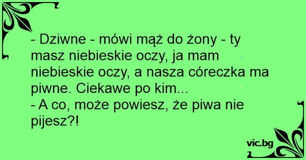 - Dziwne - mówi mąż do żony - ty masz niebieskie oczy, ja mam niebieskie oczy, a nasza córeczka ma piwne. Ciekawe po kim...