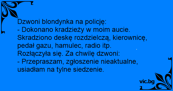 Грешка Lucky Driver Grand Theft Auto 10.000 Euro gewonnen verantwortungsvoller Autofahrer βραβείο του καλύτερου οδηγού Από το κακό... Полицай спрял лек автомобил, погледнал към шофьора, който здраво е затегнал обезопасителния колан и казва: Катаджия спира кола за проверка през нощта. Блондинка звъни в полицията: Катаджия спира една кола и казва: Ein Polizist hält einen Wagen an, in dem drei Personen sitzen, und verlangt den Führerschein. Der Fahrer sagt: Auf der Autobahn wird ein Auto von Polizisten angehalten. A California Highway Patrolman pulled a car over and told the driver that because he had been wearing his seat belt, he had just won $5,000 in the statewide safety competition. Σταματάνε αστυνομικοί κάποιο αμάξι στην εθνική οδό Αστυνομικός: Anruf bei der Polizei: Fährt ein Österreicher über die Deutsch-Österreichische Grenze. Anruf bei der Funkzentrale der Polizei: "Helfen Sie mir, man hat aus meinem Wagen Lenkrad, Handbremse und Armaturenbrett geklaut!" Minuten später meldet sich der Streifenwagen: "Hat sich erledigt. Der Kerl ist besoffen und sitzt auf dem Rücksitz..." Pronto, Polizia? Vorrei denunciare un furto.Poco fa sono salito in auto, ed ho visto che mi hanno rubato il cruscotto, il volante, la leva del cambio e tutti e tre i pedali! Dopo dieci minuti...... Un policier arrête une voiture à l'entrée de l'autoroute, il fouille la voiture et trouve une valise remplit de billet : - Fantastique ! répond le conducteur. - Qu'allez vous faire de tout cet... Det var invigning av en ny bro. Efter några dagar så kom det en familj åkande i en bil. Och då stod det en polis där och stoppade dem och sa: - Gratulerar, ni ärvår miljonte bilist! Ni har vunnit... Harald ringer polisen och säger: - Jag vill anmäla ett inbrott i min bil. - Jaha, vad har du blivit av med? - Det mesta: ratten, pedalerna, växelspaken och handbromsen. En kvart senare ringer... Ahmed rijdt met de wagen over een brug. Plots doet een patrouille hem stoppen. De agent zegt: "Proficiat meneer, u bent de 100ste wagen die over deze nieuwe brug rijdt en u ontvangt daarom 1000... Полицейский останавливает машину: - Вы первый кто проехал на этом перекрёстке без нарушений, вот вам 1000 рублей. - О! Права куплю! - Вы без прав? Жена: -Не слушайте его, чего по пьяни не скажешь?... Uma loira ligou para a polícia para avisar que ladrões tinham entrado em seu carro: — Eles levaram o painel do carro, o volante, o pedal do freio, do acelerador e até a alavanca do câmbio! —... Polisen stoppar en bil och gratulerar föraren: - Grattis ni är den tusende bilisten som kom ihåg säkerhetsbältet. Ni har vunnit 10000 kr. Vad ska ni göra med pengarna, undrar polisen. - Jag tror... En syrian åkte bil när polisen stoppade honom. Polisen: - Grattis du vinner tjugotusen kronor för att du är en av 1000 billister som använder bälte. Syrianen: - Tack så mycket! Polisen: - Vad ska... In de auto zit een man die met zijn vrouw en schoonmoeder door de Kennedy Tunnel rijdt. Zijn vrouw zit te suffen en zijn schoonmoeder slaapt. Wat later wordt hij aangehouden door een politieagent,... A drunk phoned police to report that thieves had been in his car. "They've stolen the dashboard, the steering wheel, the brake pedal, even the accelerator!" he cried out. However, before the police... John was driving when a policeman pulled him over. He rolled down his window and said to the officer, "Is there a problem, Officer?" "No problem at all. I just observed your safe driving and am... En trønder skulle kjøre over en bru. Han hadde med seg kona og svigermor. Der sto det en politimann. Gratulerer du er nummer 10000 som kjører over broen, og har vunnet 10000kr. Trønderen: – Jippi... Ein Auto fährt über die Grenze und wird von einem Polizisten angehalten. „Herzlichen Glückunsch! Sie sind der hunderttausendste Autofahrer, der diese Grenze passiert. Dafür bekommen Sie 8.200 Euro.... An elderly Floridian called 911 on her cell phone to report that her car has been broken into. She is hysterical as she explains her situation to the dispatcher: "They've stolen the stereo, the... Ein Auto wird auf einer Brücke von einem Polizisten angehalten . Dieser klopft an die Scheibe, woraufhin der Autofahrer öffnet. Der polizist: herzlichen Glückwunsch Sie sind der 1000000 Fahrer auf... Polis adamın birini köprü çıkışında durdurur ve tebrikler kemerinizi bağladığınız için bizden 5000 tl kazandınız der adam sevinir polis peki bu parayı nasıl değerlendireceksiniz? diye sorar. Adam -... Poliisi piti ratsiaa ja tarkasti että turvavyöt ovat autoilijoilla kiinni. Vihdoin tuli kohdalle tuhannes kärry, jossa kaikilla vyöt olivat kiinni. Poliisi antoi kuskille palkinnon ja kyseli, mitä... Polis, köprü çıkışında çevirdiği aracın şoförünü tebrik etmiş: - Kemer taktığınız için 50 milyon lira ile ödüllendirildiniz!.. Adam duruma anlam vermeye çalışırken polis sormuş : - Bu parayla ne... Drie mensen zitten in een auto en rijden over een brug, komt de politie achter hun aan en houdt hun tegen. Zegt de politieagent: "Gefeliciteerd, jullie zijn de duizendste auto die over deze brug... Махнув випадково даішник палицею. Хотів підійти вибачитися. Тільки підійшов, водій: - Я права забув! Дружина поруч: - Бреше він все! Пив вчора! Теща ззаду: - На краденій машині завжди зловлять!... Die Polizei stoppt auf einer Brücke ein Auto. Der Polizei sagt