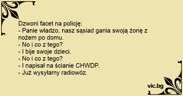 - Panie władzo, nasz sąsiad gania swoją żonę z nożem po domu.
