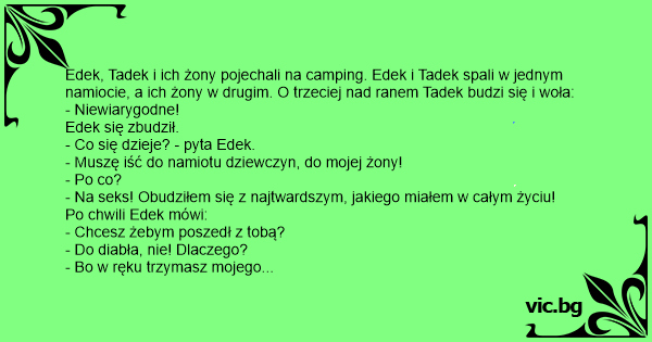 Edek, Tadek i ich żony pojechali na camping. Edek i Tadek spali w jednym namiocie, a ich żony w drugim. O trzeciej nаd ranem Tadek budzi się i woła:
