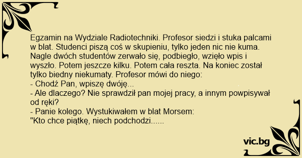 Egzamin na Wydziale Radiotechniki. Profesor siedzi i stuka palcami w blat. Studenci piszą coś w skupieniu, tylko jeden nic nie kuma. Nagle dwóch studentów zerwało się, podbiegło, wzięło wpis i wyszło. Potem jeszcze kilku. Potem cała reszta. Na koniec został tylko biedny niekumaty. Profesor mówi do niego: