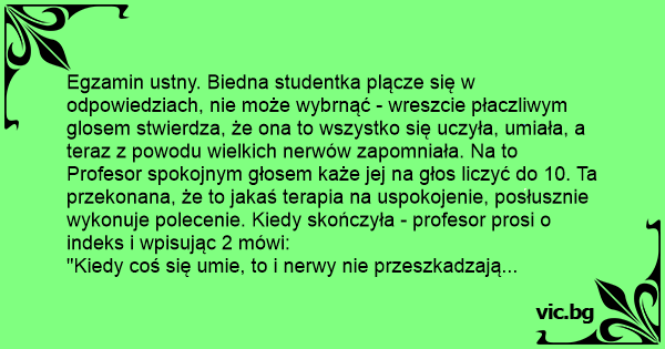 Egzamin ustny. Biedna studentka plącze się w odpowiedziach, nie może wybrnąć - wreszcie płaczliwym glosem stwierdza, że ona to wszystko się uczyła, umiała, a teraz z powodu wielkich nerwów zapomniała. Na to Profesor spokojnym głosem każe jej na głos liczyć do 10. Ta przekonana, że to jakaś terapia na uspokojenie, posłusznie wykonuje polecenie. Kiedy skończyła - profesor prosi o indeks i wpisując 2 mówi: