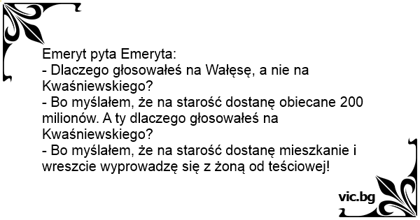 - Bo myślałem, że na starość dostanę obiecane 200 milionów. A ty dlaczego głosowałeś na Kwaśniewskiego?