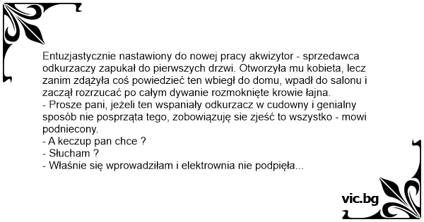 - Prosze pani, jeżeli ten wspaniały odkurzacz w cudowny i genialny sposób nie posprząta tego, zobowiązuję sie zjeść to wszystko - mowi podniecony.