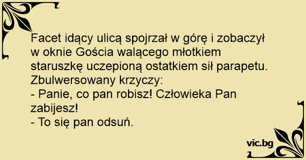Facet idący ulicą spojrzał w górę i zobaczył w oknie Gościa walącego młotkiem staruszkę uczepioną ostatkiem sił parapetu. Zbulwersowany krzyczy: