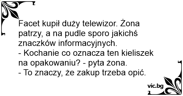 Facet kupił duży telewizor. Żona patrzy, a na pudle sporo jakichś znaczków informacyjnych.