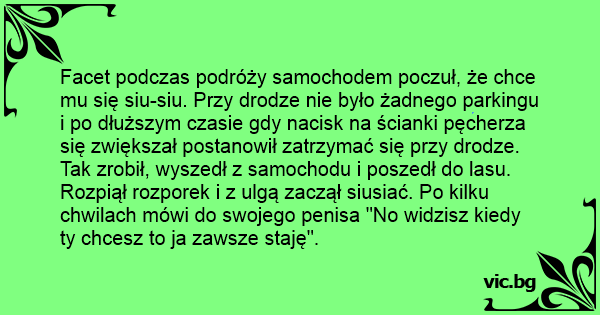 Facet podczas podróży samochodem poczuł, że chce mu się siu-siu. Przy drodze nie było żadnego parkingu i po dłuższym czasie gdy nacisk na ścianki pęcherza się zwiększał postanowił zatrzymać się przy drodze. Tak zrobił, wyszedł z samochodu i poszedł do lasu. Rozpiął rozporek i z ulgą zaczął siusiać. Po kilku chwilach mówi do swojego penisa "No widzisz kiedy ty chcesz to ja zawsze staję".