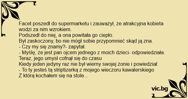 "Excuse me," he says to her, "do we know each other?" "Sure," she answers, "one of my children is yours!" The guy confused, thinks and suddenly remembers the only time he cheated his wife. So he asks her: "Were you that stripper invited at a bachelor party at the suburbs last spring and we ended...
