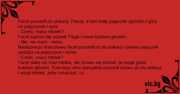 Facet dalej nie miał młotka, ale znowu się zdziwił, że pająk gada ludzkim głosem. Trzeciego dnia specjalnie poszedł znowu do tej ubikacji i wziął młotek, żeby zobaczyć, co będzie robił pająk z tym młotkiem.