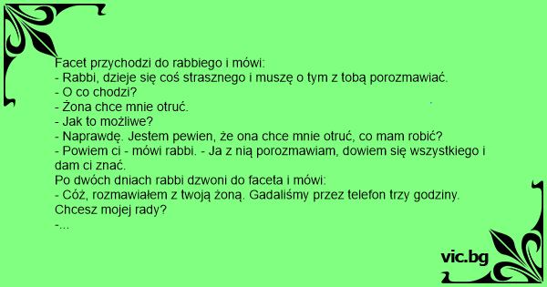 - Powiem ci - mówi rabbi. - Ja z nią porozmawiam, dowiem się wszystkiego i dam ci znać.