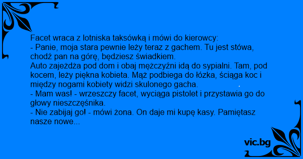 Facet wraca z lotniska taksówką i mówi do kierowcy: