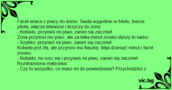 Facet wraca z pracy do domu. Siada wygodnie w fotelu, bierze pilota, włącza telewizor i krzyczy do żony: