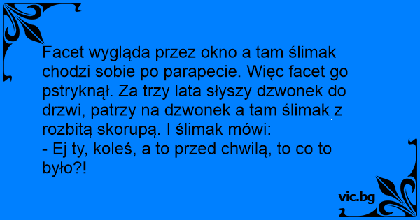 Facet wygląda przez okno a tam ślimak chodzi sobie po parapecie. Więc facet go pstryknął. Za trzy lata słyszy dzwonek do drzwi, patrzy na dzwonek a tam ślimak z rozbitą skorupą. I ślimak mówi: