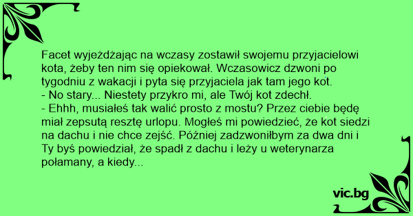 Facet wyjeżdżając na wczasy zostawił swojemu przyjacielowi kota, żeby ten nim się opiekował. Wczasowicz dzwoni po tygodniu z wakacji i pyta się przyjaciela jak tam jego kot.