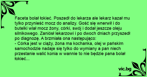 Faceta bolał łokieć. Poszedł do lekarza ale lekarz kazał mu tylko przynieść mocz do analizy. Gość się wnerwił i do butelki wlał mocz żony, córki, swój i dodał jeszcze oleju silnikowego. Zaniósł lekarzowi i po dwoch dniach przyszedł po diagnozę. A brzmiała ona następująco: