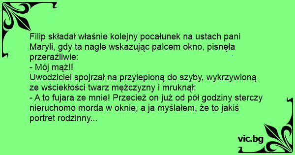 - A to fujara ze mnie! Przecież on już od pół godziny sterczy nieruchomo morda w oknie, a ja myślałem, że to jakiś portret rodzinny...