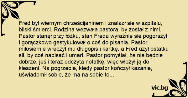 Fred był wiernym chrześcijaninem i znalazł sie w szpitalu, bliski śmierci. Rodzina wezwała pastora, by został z nimi. Pastor stanął przy łóżku, stan Freda wyraźnie się pogorszył i gorączkowo gestykulował o coś do pisania. Pastor miłosiernie wręczył mu długopis i kartkę, a Fred użył ostatku sił, by coś napisać i umarł. Pastor pomyślał, że nie będzie dobrze, jeśli teraz odczyta notatkę, więc włożył ją do kieszeni. Na pogrzebie, kiedy pastor kończył kazanie, uświadomił sobie, że ma na sobie to samo ubranie, co w chwili śmierci Freda.