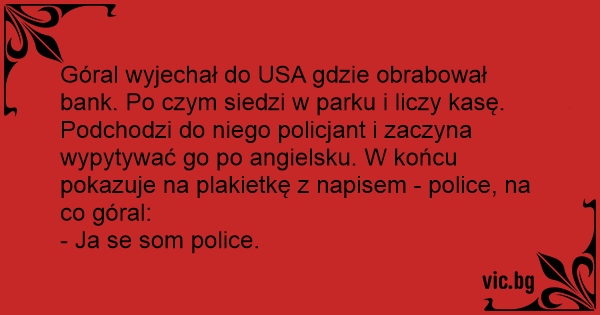 Góral wyjechał do USA gdzie obrabował bank. Po czym siedzi w parku i liczy kasę. Podchodzi do niego policjant i zaczyna wypytywać go po angielsku. W końcu pokazuje na plakietkę z napisem - police, na co góral: