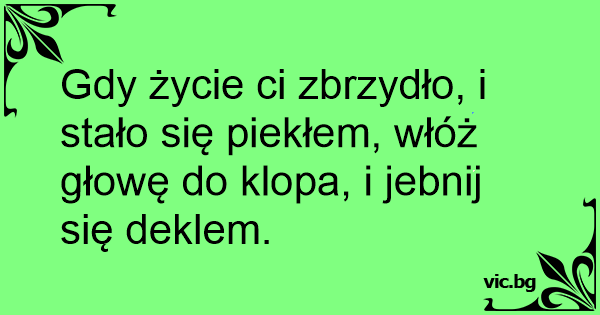 Gdy życie ci zbrzydło, i stało się piekłem, włóż głowę do klopa, i jebnij się deklem.