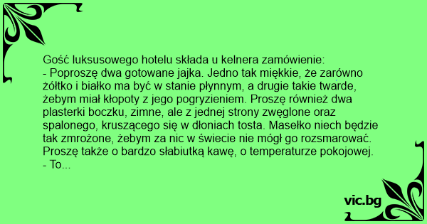 - Poproszę dwa gotowane jajka. Jedno tak miękkie, że zarówno żółtko i białko ma być w stanie płynnym, a drugie takie twarde, żebym miał kłopoty z jego pogryzieniem. Proszę również dwa plasterki boczku, zimne, ale z jednej strony zwęglone oraz spalonego, kruszącego się w dłoniach tosta. Masełko niech będzie tak zmrożone, żebym za nic w świecie nie mógł go rozsmarować. Proszę także o bardzo słabiutką kawę, o temperaturze pokojowej.