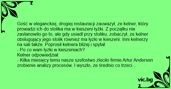 Gość w eleganckiej, drogiej restauracji zauważył, ze kelner, który prowadzi ich do stolika ma w kieszeni łyżki. Z początku nie zastanowiło go to, ale gdy usiadł przy stoliku, zobaczył, ze kelner obsługujący jego stolik również ma łyżki w kieszeni. Inni kelnerzy na sali także. Poprosił kelnera bliżej i spytał: