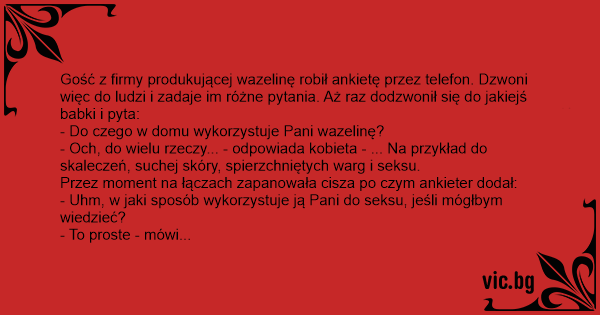 Gość z firmy produkującej wazelinę robił ankietę przez telefon. Dzwoni więc do ludzi i zadaje im różne pytania. Aż raz dodzwonił się do jakiejś babki i pyta: